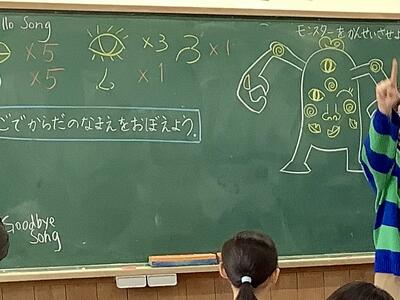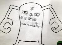 さて次は、モンスターを完成させるらしいですね。おそらく「eye」とか「nose」とかを教わったのでしょう。さいころを振って出た目の数だけ、その部分があるモンスターだということです。ということで、