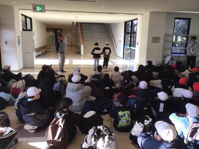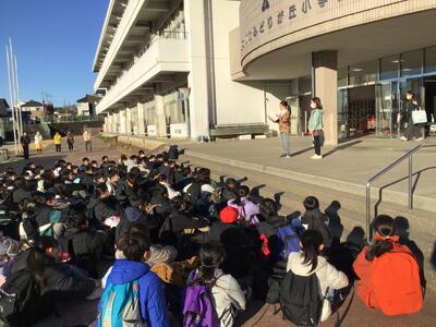 みどりが丘小の廊下は、やたらと広い。いろいろな活動のためのオープンスペースになっています。こういうときに役に立ちますね。暖房もあるんですよ。