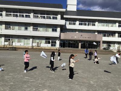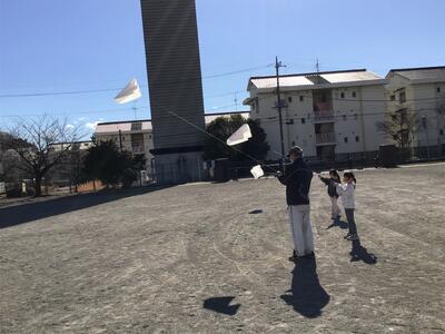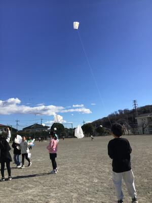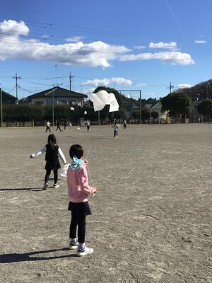 気持ちのよい青空の中で凧あげを楽しむ1年生たちでした。
