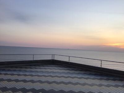 こちらは、海浜自然の家の2階テラスの部分です。建物をバックに1枚!後ろに見えるのは、建物の中央部分ですが、現場では、写真以上に大きくそびえたって見えます。