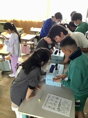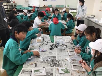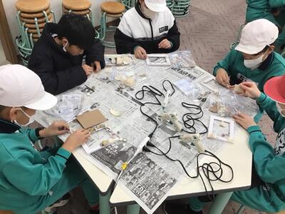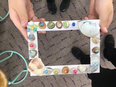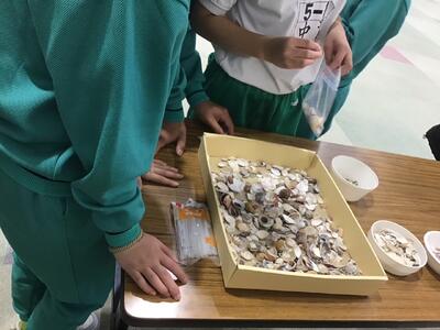 2日目の活動開始です。朝の海岸散歩で拾ってきた貝殻や石が役に立つようです。