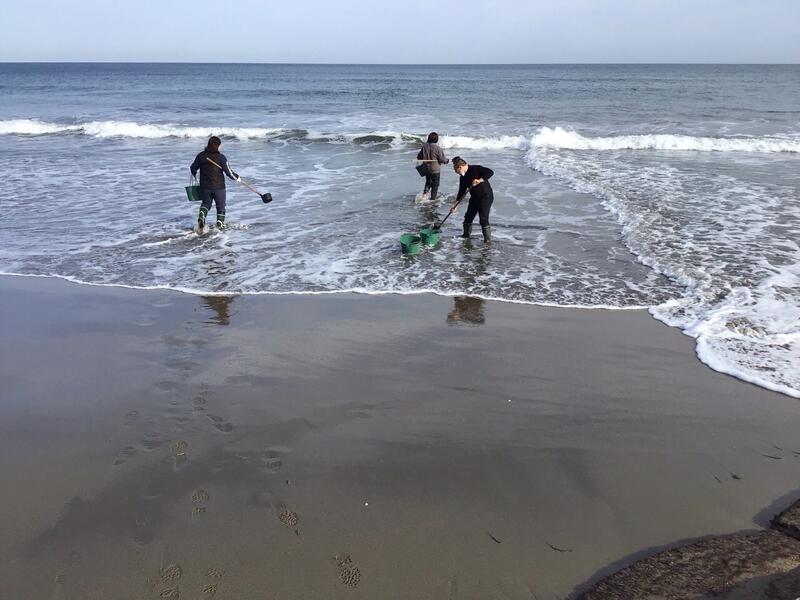懐中電灯の明かりを頼りに海岸に下りていきます。