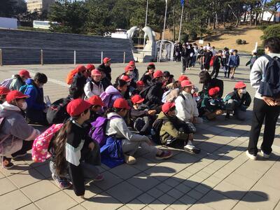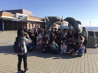 すばらしい青空の下、臨海自然教室に出発する5年生たちが集まってきました。