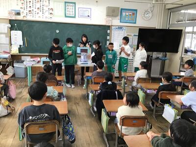 保健委員会のメンバーが2年生教室へ出張中です。今回のお仕事は「手洗いチェック」でした。
