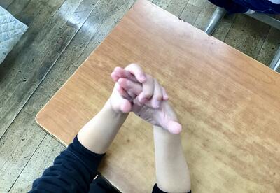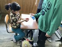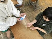 手に塗り込みます。これが汚れの変わりですね。その後、子供たちは水道に行って、しっかり手を洗ってきます。