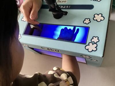 白く光っています。光っているのは先ほどのクリームですが、きちんと洗えなかったことは、ばっちり分かっていしまいます。保健委員会、いい仕事してますねぇ。