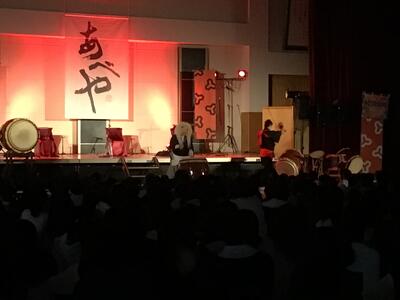 「津軽三味線あべや」の皆さんによる公演の一幕です。午前中は6年生とワークショップを行い三味線や民謡について教えていただきました。