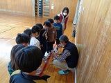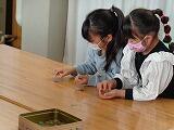 コマ回し、メンコ、ゴム飛び、羽子板、おはじき、おりがみ、お手玉、けん玉、あやとりなどの遊びを、グループに分かれて体験しました。