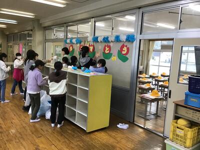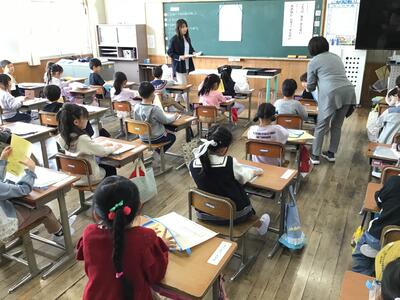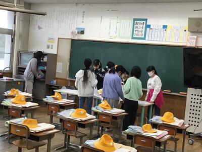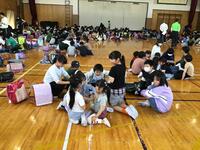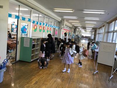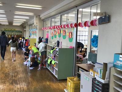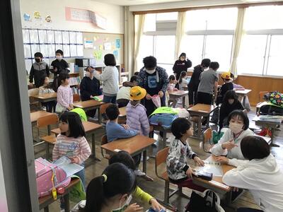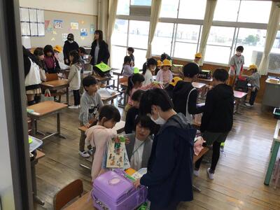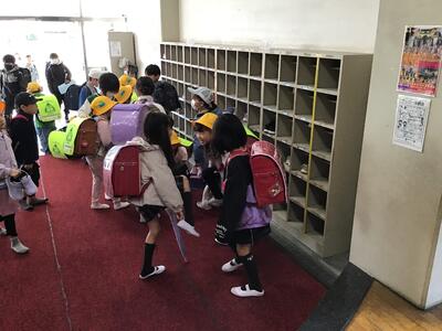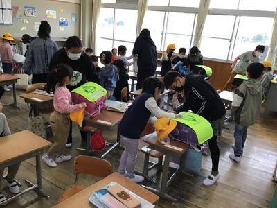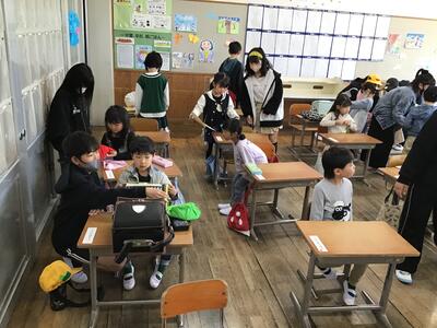 続いては、荷物の整理ですね。教室の中では、6年生がお手伝いをしています。本校のピアサポートの取組みのひとつになっています。6年生たちは、丁寧に笑顔で1年生たちが自分でできるようになるようにサポートしていました。とても頼もしい6年生です。