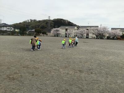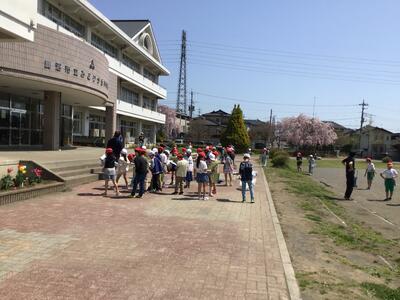 おや、校長室の前を通っていきます。2時間目ぐらいかな。みんなで手を振ってくれました。学校探検でしょうか。桜の前で記念撮影でしょうか。
