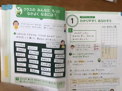 教科書を見て、早速、左のページのデータが、バラバラであることに気付いたようです。この気づきが大切、この後、データを分かりやすくするために整理して表やグラフに表していくのでしょう。