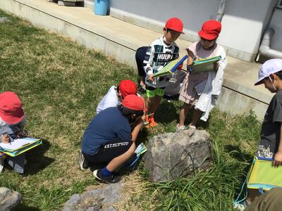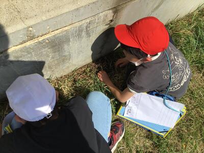 子どもたちは、虫眼鏡片手に様々なものを見つけ出しています。