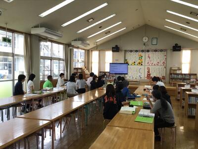 ここは、図書委員会です。3階から順に降りてきたので1階の図書室は最後になりました。みんなの意見が最後にまとまりつつあるようです。
