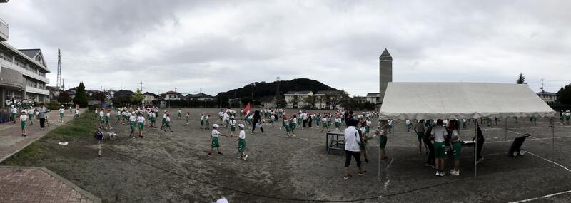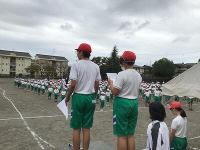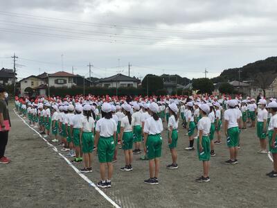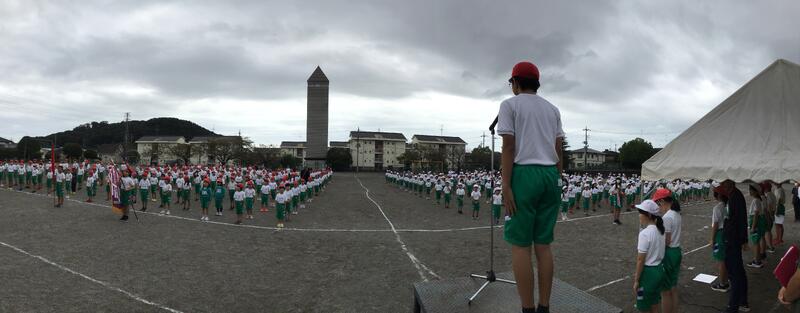 こちらは、今日の話題。運動会の全体練習が始まりました。今日は、応援席や開会式の並び方の確認を行いました。すっかり秋空ですね。