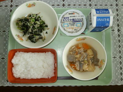ごはん、牛乳、ジャガイモのそぼろ煮、冷や奴、のり和え
