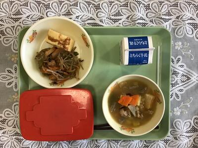 ごはん、牛乳、厚焼き卵、五目きんぴら、さつま汁