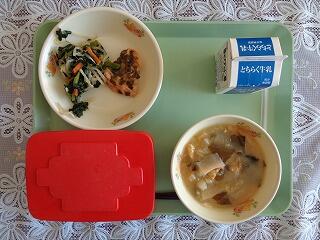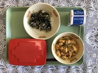 ごはん、牛乳、鶏肉のニラソースがけ、和風和え、カンピョウのみそ汁