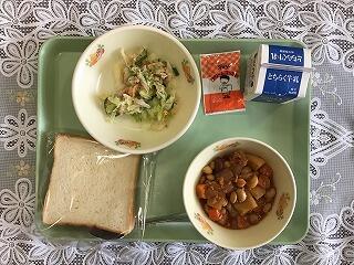 給食には栄養豊富な豆類が多く登場します。今日のチリコンカンはいつものケチャップ味とは違い、カレー風味に工夫されており、おいしくいただきました。