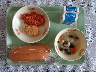 コッペパン、牛乳、スラッピージョー、コーンコロッケ、ポトフ