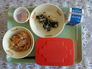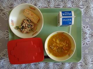 ごはん、牛乳、野菜スープカレー、ほうれん草とキャベツとツナの和え物