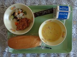 バターロール、牛乳、メンチカツ、マカロニソテー、コロコロ野菜のスープ