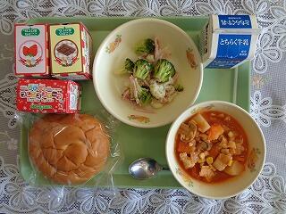 ハチミツパン、牛乳、鶏肉のケチャップ煮、花野菜サラダ、セレクトケーキ