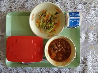 大麦ごはん、牛乳、チキンカレー、キャベツのサラダ