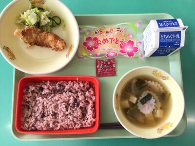 ワクワクの給食は、こんな感じでした。お赤飯ですね。「おめでとう」と書かれたクレープもあります。何のお祝いかな?!と思ったら「入学おめでとう献立」でした。もう1年生のいる風景も当たり前になっていますが、改めて「ご入学おめでとうございます。」