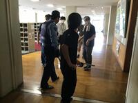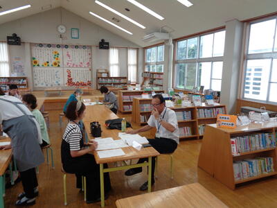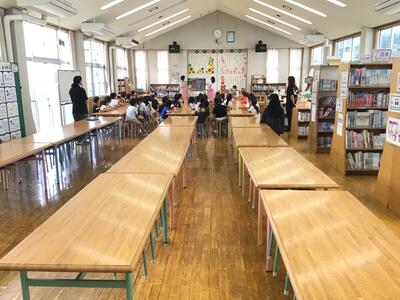 さて、久しぶりの業間、歩いていると、図書室に集まる人影がありました。1年生のようですね。
