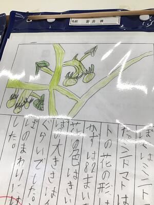 教室の後ろには、育てている野菜の観察記録などもありました。成長の様子がよく書かれていますね。