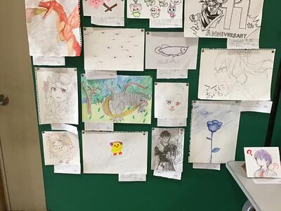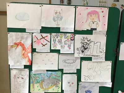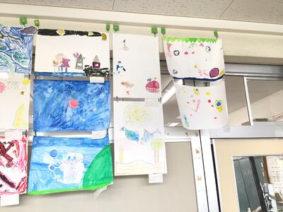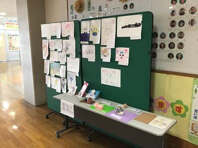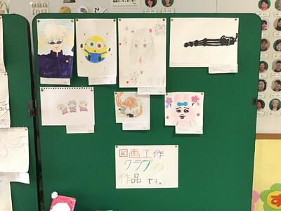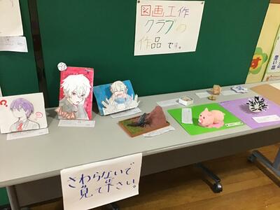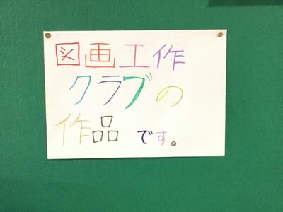 図書室前の廊下では、図画工作クラブの作品展が行われていました。