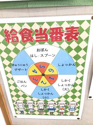 給食当番表もありますね。小学校ですから当たり前ですが、つくづく見ると大人の皆さんには懐かしいでしょ。