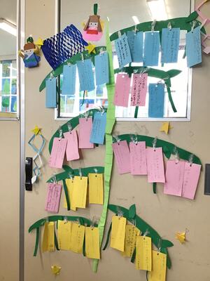 教室の入口には、ご覧のような七夕飾りがあります。面白くながめていると、