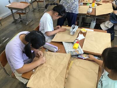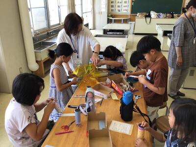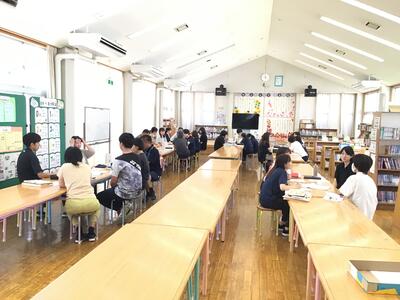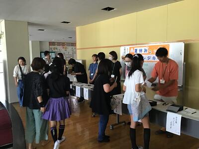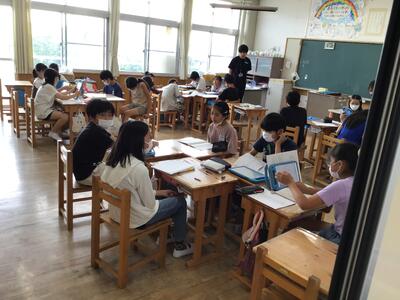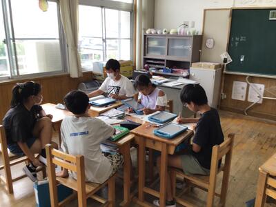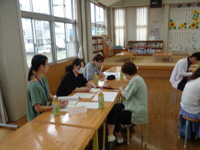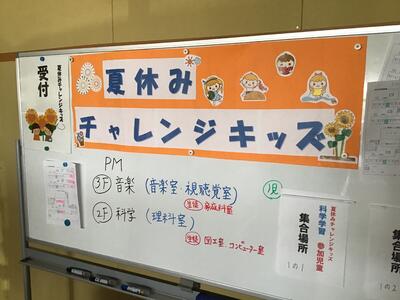 日程等の説明から始まり、それぞれのグループで内容の打ち合わせが行われます。このチャレンジキッズ!地域のボランティアティーチャーをお招きしてのイベントで、学校ではできない夏休みの楽しい体験学習が行われます。