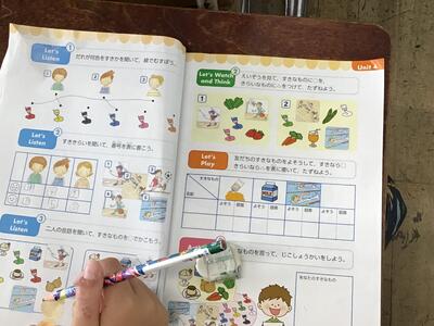 元気、元気、よく手が挙がります。テキストは、これ!今は、聞き取りの練習をしています。
