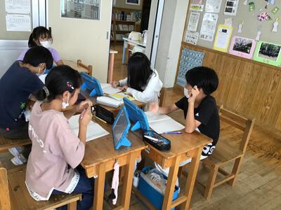 この授業のテーマは、「提案する文章を書く」ことで、自分たちのチームで内容を決め、調べ学習をしつつ考えをもち、解決した課題についての提案をするとのことです。近くにいた児童が説明してくれました。頼りになります。