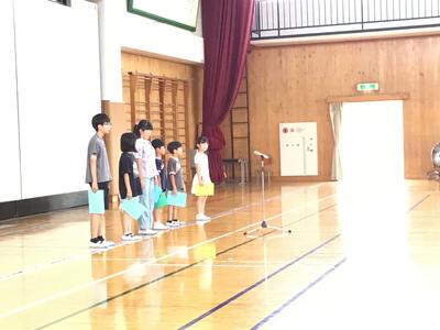 まずは、児童代表のスピーチです。今回は、2年生と3年生の代表が、1学期の振り返りと2学期の目標について話しました。みんなしっかりと話すことができてとても素敵です。
