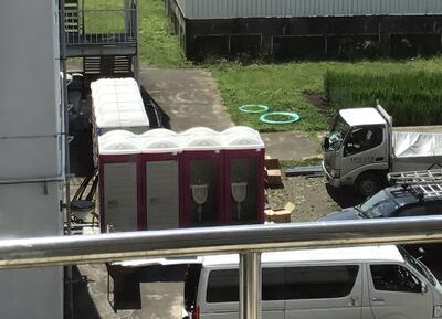 中庭に仮設トイレが設置され、窓には足場が組まれています。
