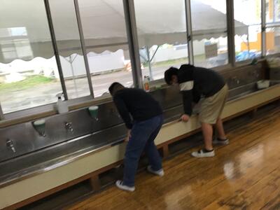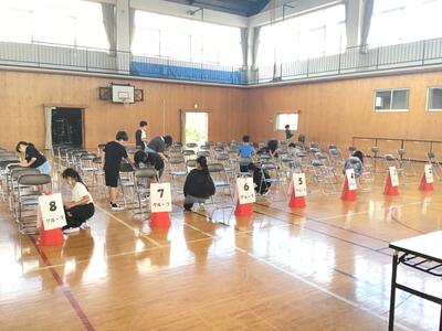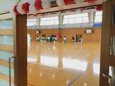 運動会日課2日目、全校練習前に6年生らしき影が体育館にあります。
