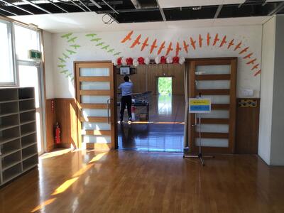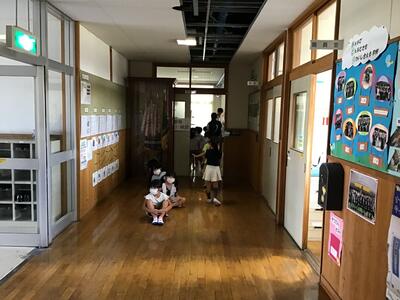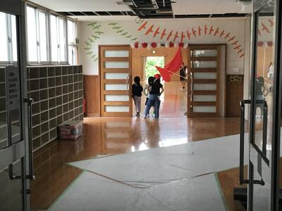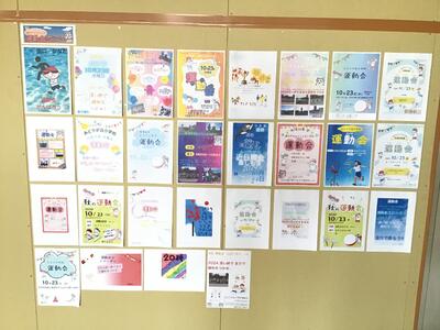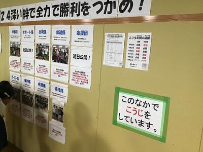 昇降口前のトイレ工事区画を仕切る壁に運動会コーナーができていました。みんな興味津々で見ています。