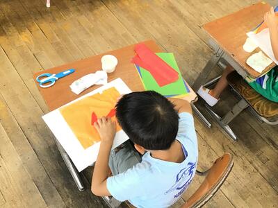 図工の授業、版画ですね。下絵を描いたり、彫ったりしています。