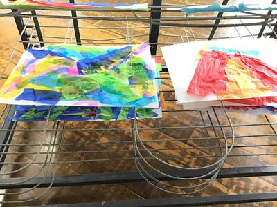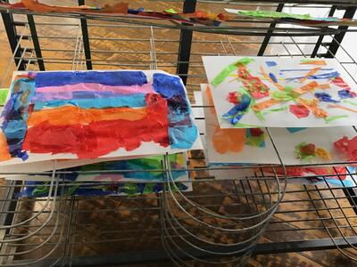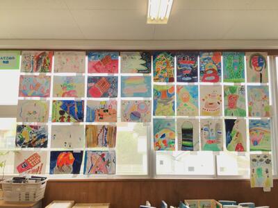教室の外には、楽しい水彩画が掲示してあります。タイトルは「ヘンテコ山」ということのようで、自分なりのヘンテコが表現されていて、これは楽しい!