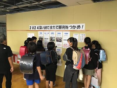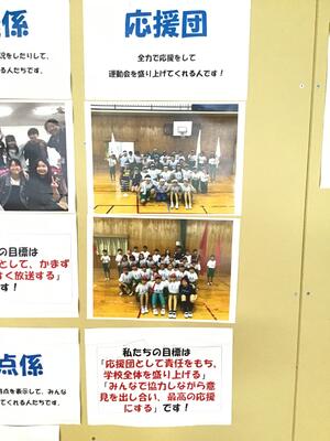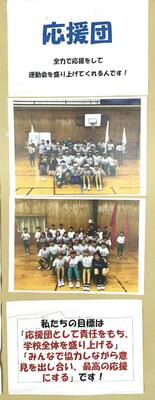 昇降口前の運動会掲示物に「近日公開予定」だった応援団のメンバー紹介と目標の掲示が登場しました。