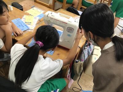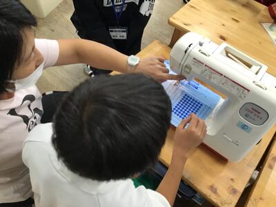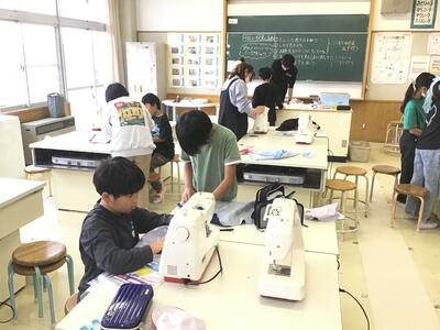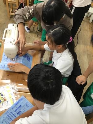 5年生家庭科の授業にミシンボランティアの皆さんが来ているという話です。