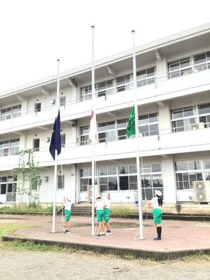今日のフリータイム。整列した子供たちと国旗式などが朝礼台前に集まっています。開閉会式の練習でしょうか。