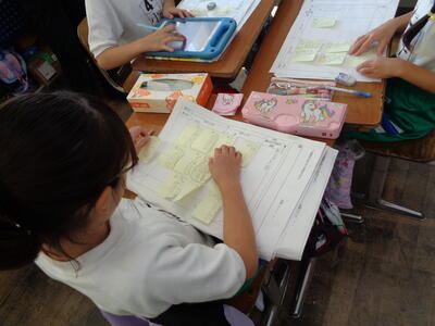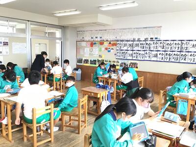 これもタブレットを使い文章をデータ化することで、友達に示したり、手直しを簡単にしたりとICT機器を活用しています。「自分で考え、書く」「交流し友達の意見を参考にする」両方大切にしながら、終始、和やかに学習を進めていました。