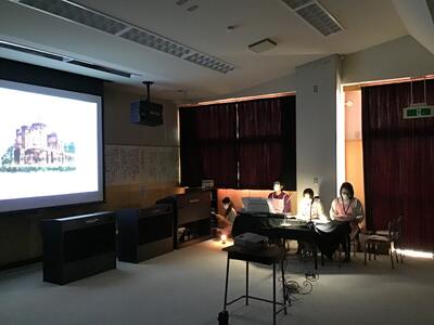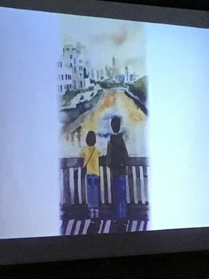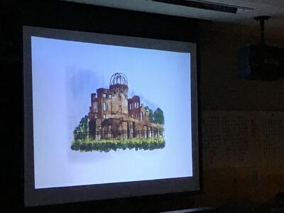 今日の読み聞かせのテーマは「戦争」。スライドにあるのは原爆ドームですね。
