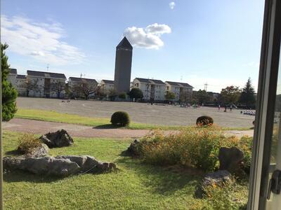 秋空の下、運動会の練習をする5,6年生の姿が校長室の窓から見られます。