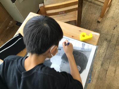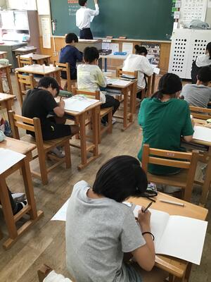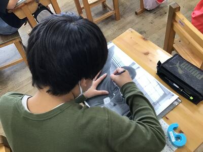 図工の授業、版画ですね。下絵を描いたり、彫ったりしています。