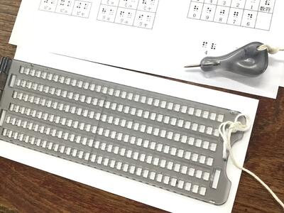 こちらが点字を作る道具です。体験用なのでちょっと小さめとのことですが、1つ1つ針(のようなもの)で打って作っていくのは驚きです。